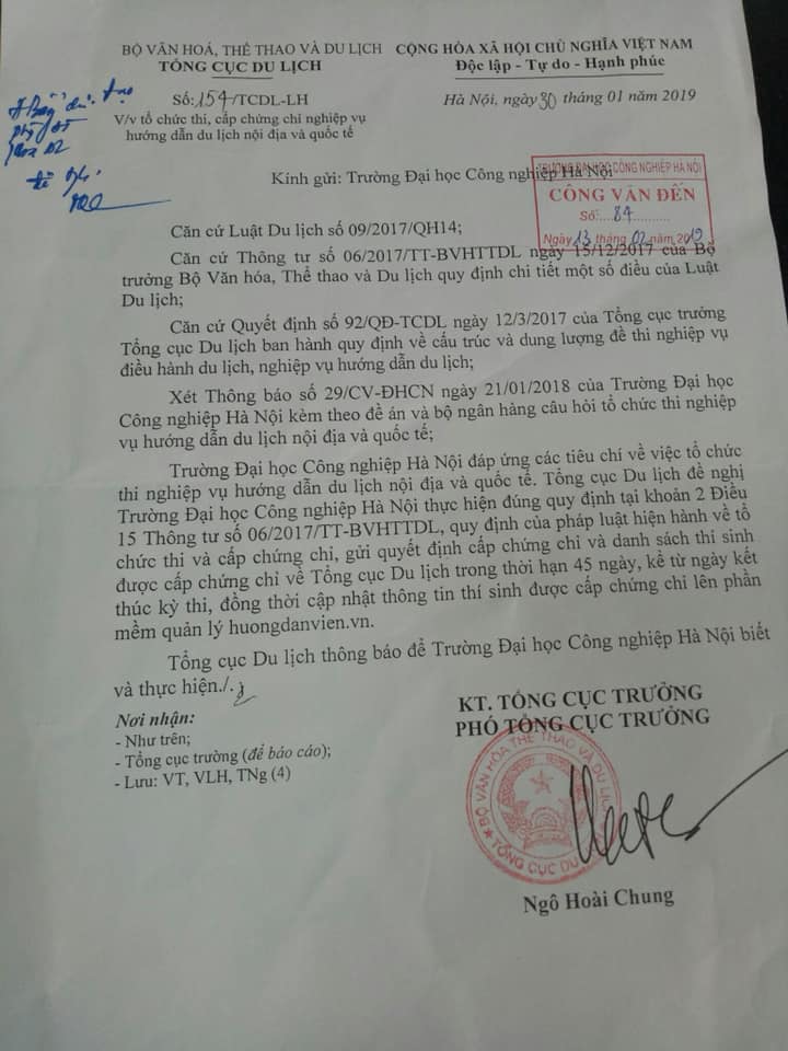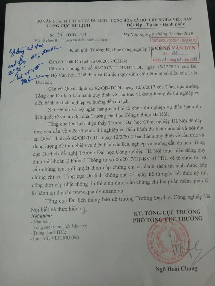 Thông báo về việc Tổ chức thi, cấp chứng chỉ nghiệp vụ hướng dẫn du lịch và Điều hành du lịch nội địa và quốc tế.